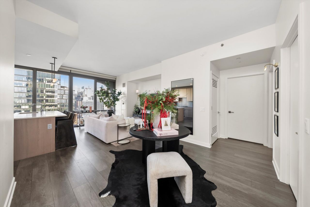 Rarely available, impeccably designed and furnished by an award-winning design firm, this one-bedroom, one-bath home delivers elevated modern living with desirable eastern exposure. The open-concept kitchen features sleek back-painted glass cabinetry, integrated Bosch and Fisher & Paykel appliances, and three-centimeter quartz countertops with a dramatic full-height backsplash. Enjoy 9'6 ceilings, roller shades, wide-plank flooring throughout, and generous custom-built closets. Offered furnished or unfurnished.