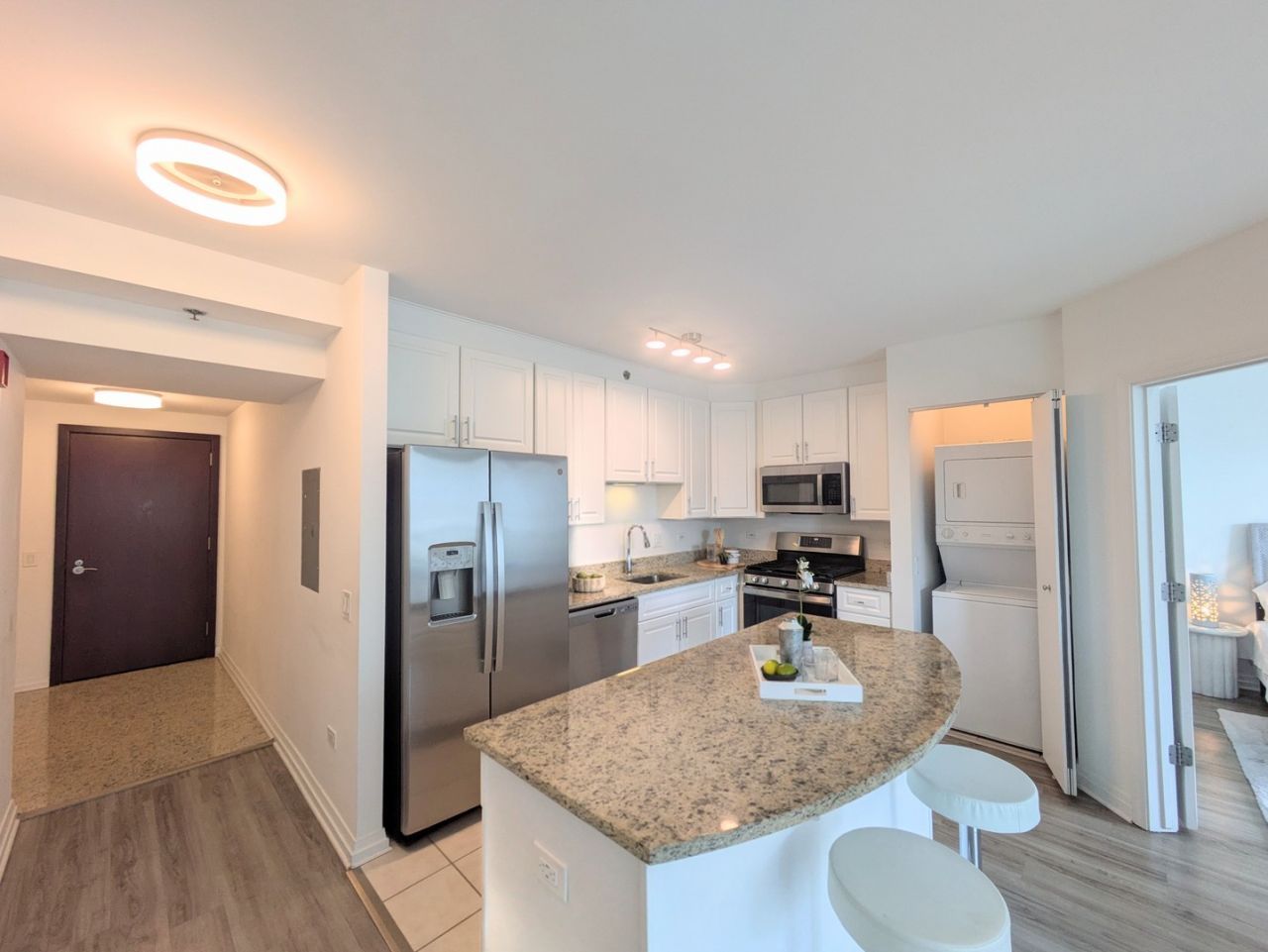 CONTEMPORARY, URBAN 1-BED FOR RENT WITH ALL THE FEATURES YOU WANT...Timeless open kitchen with spacious island bar, stainless steel appliances, 42 inch pristine white cabinets. The generous living room features newer hard surface floors, and plenty of room for an office, Zoom area, and dining table. Tons of natural light and views of the city skyline, with a huge wall of windows. The primary suite features an enormous walk-in closet. In home washer-dryer. Bathroom with soaking tub. Located at 33 W. Ontario, the building offers 24-hour door staff, an outdoor pool and sundeck with grilling area, fitness center, resident lounge, conference room, package receiving, and a storage locker. The location puts you just steps from the Magnificent Mile, Whole Foods, Trader Joe's, and Jewel, with easy access to the Loop, the lakefront, running and bike paths, public transportation, and expressways.