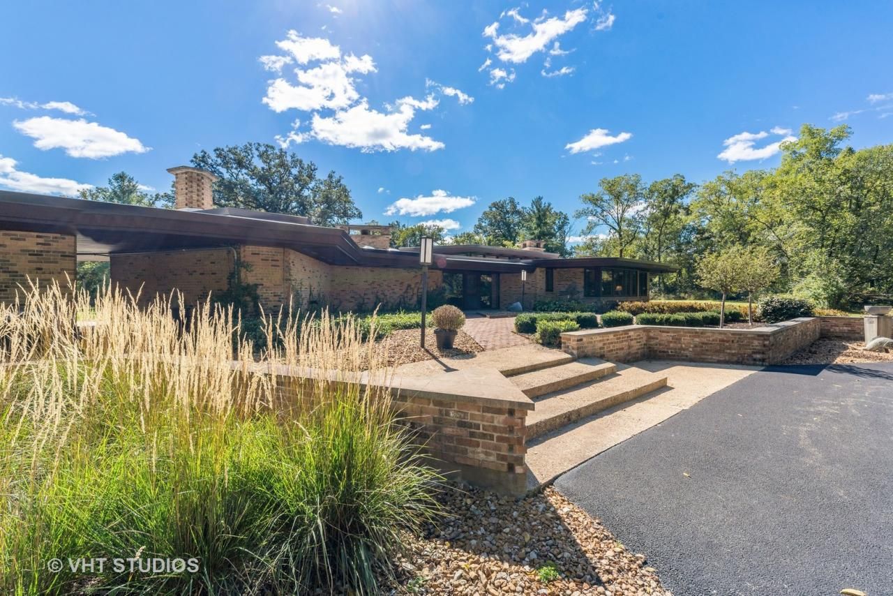 First time for sale on the open market! Enwilde is the name that original owner Chester Trowbridge gave to his home in Wayne: A gorgeous, sprawling, Usonian-inspired MCM / mid-century modern ranch home set on 6+ beautiful, private acres. Trowbridge had originally hired Frank Lloyd Wright to design the home, but Wright ended the relationship, so the architect is unknown - however, the home is heavily influenced by Wright's architecture. Built in 1957 and expanded in 1977, the home features 4 bedrooms (including one with its own fireplace), 3 1/2 baths and a wonderful layout perfect for those who love organic modern or MCM design. In addition to the bedrooms and bathrooms, the 4,153 square foot home features an inviting entry way, dining room with fireplace and high ceilings, a vast living room with wet bar, spacious family room with another massive fireplace, a modern kitchen with wood slat panels, a sun room / second dining area plus a large laundry and utility room. Throughout the house you'll find spectacular natural materials & desirable modern architectural features such as cypress walls & ceilings, New York bluestone floors with in-floor radiant heat, built-ins in almost every space and floor to ceiling windows offering calming views of the surrounding nature. Wonderfully sited on a 6.22 acre private lot (great for equestrians!) toward the end of a cul-de-sac, the brick & glass home enjoys acres surrounded by mature trees, as well as a multi-level stone patio, large in-ground pool and even has a barn with an upstairs studio. Just minutes from St. Charles shopping & restaurants. Don't miss the opportunity to be the next stewards of this extremely special modern home! Featured in Crain's and Modern Illinois!