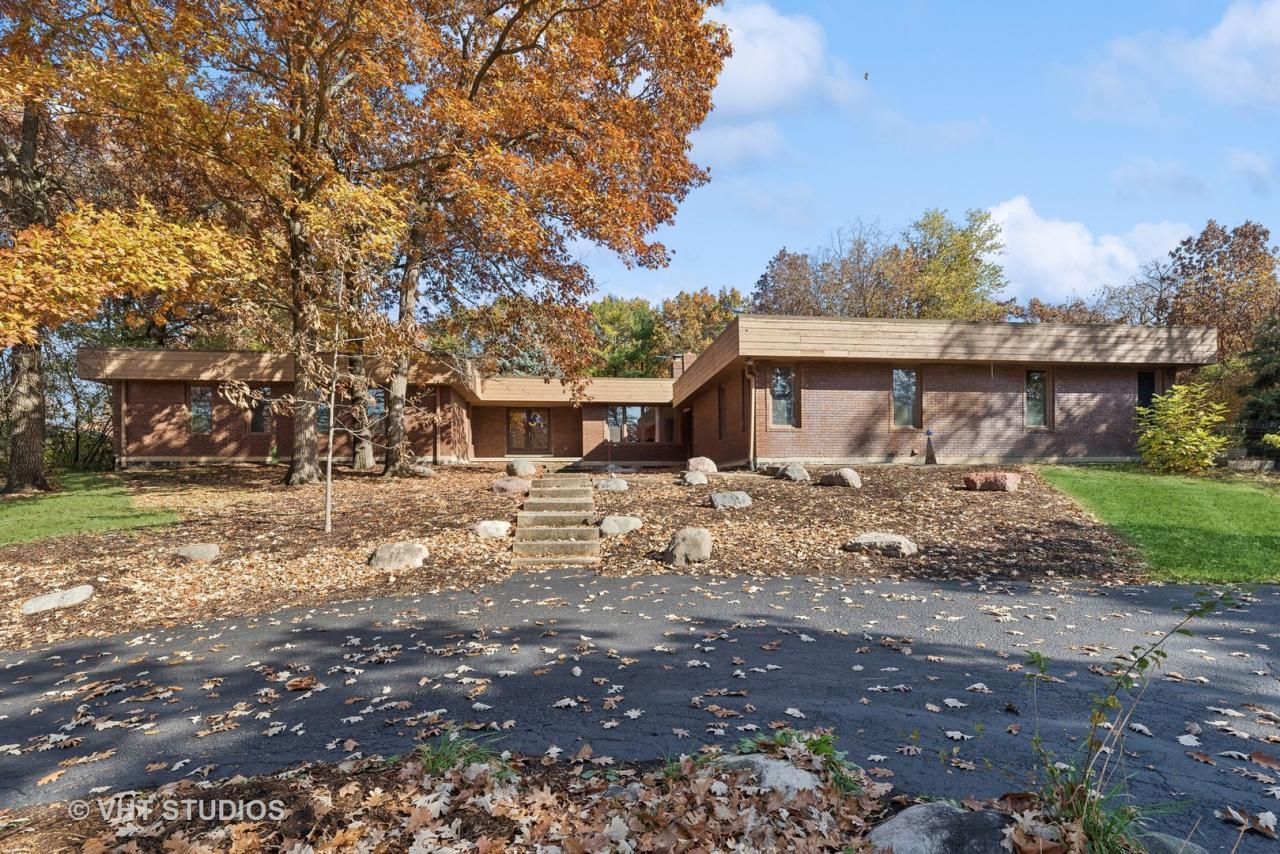 Welcome to 21677 N Sylvander Drive in Deer Park. This is a fantastic, sprawling late-century modern Executive ranch on a quiet street designed & built by Mitch Tarzian. Featuring beautiful materials such as brick, cedar, stone boulders, vast expanses of glass and travertine floors plus a spacious, open floor plan that includes a sunken living room, sunken Primary Suite, floor to ceiling stone walls & fireplaces, indoor planters and so much more. The Primary Suite features an enormous dual en-suite bath with two walk-in closets, tub, shower, two private water closets and tons of cabinet & counter space. In addition to bedrooms 2 & 3 is a 4th bedroom with its own en-suite that can be used as a guest suite, in-law suite or separate home office. Multiple living spaces include the sunken living room with two-sided stone fireplace with the family room on the other side, as well as the dining room, expansive kitchen with eat-in area, and a screened porch leading to a large deck. Numerous skylights add to the natural light afforded by the huge windows throughout the house. Many of the home's details are original so that you can live in it as-designed, or update to your preferences. All day-to-day needs are on the main level including a spacious laundry / mud room, so this beautiful house lives as a true ranch. There's even a 3 car garage, and a substantial partial basement with tons of storage space, and all of this high up on a hill on a beautiful lot of over 2 acres surrounded by mature trees! A vast, curving driveway has plenty of space for more than a dozen vehicles. Being close to both Barrington and Lake Zurich makes for an excellent and special place to call home. Many recent updates & improvements, including a new roof in 2022, new HVAC systems in 2022, new well equipment in 2022, as well as a freshly seal coated driveaway, extensive landscaping cleanup in recent months, exterior fascia replacements / repainted and more.