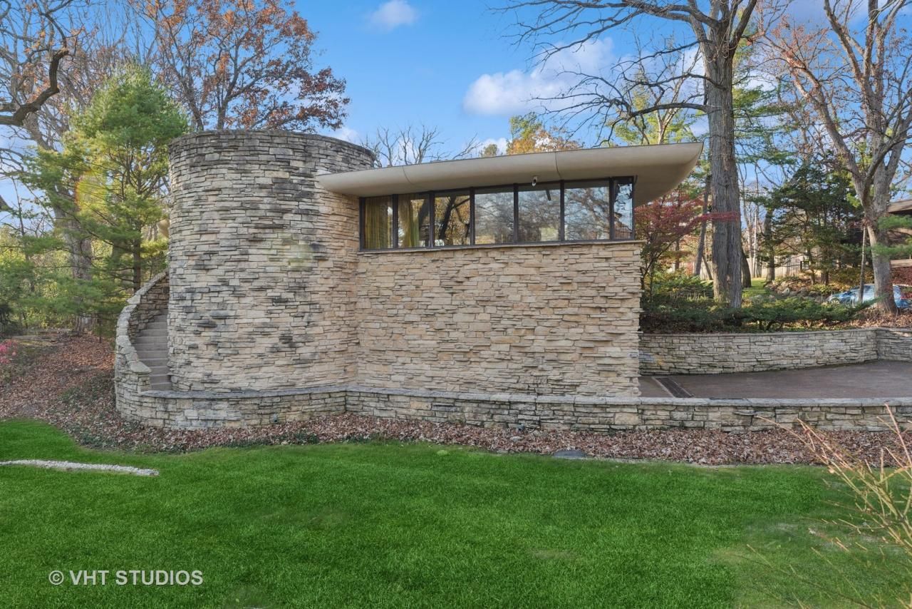 This is an absolutely stunning, one-of-a-kind, organic modern home designed by the home's original owner, Robert Rasmussen. Bob was an apprentice to Frank Lloyd Wright for a time, and took Wright's teachings about organic architecture to heart, as evidenced by this amazing mid-century modern home. Built primarily of uncoursed limestone and glass, the home features very few right angles, Rasmussen opting instead for graceful curves that sweep the house along its lot, partially set into the ground upon which the house was built, making it appear as a rocky outcropping on the terrain. Inside, wonder and delight abound, as you're surrounded by what seems like acres of walnut used for cabinetry, paneling, built-in furniture and trim, volumes of main-level storage, a feature fireplace, built-in and custom-designed furniture, a round kitchen still showcasing some original appliances and gorgeous original tile, and so much more. Down the hallway to the private areas of the home, a twin convertible bedroom features mirror-image sleeping rooms, built-in desks & wardrobes, followed by a Primary Suite with an absolutely incredible en-suite bathroom with sunken, terrazzo tub/shower and more original tile, fixtures & finishes. A study / fourth bedroom sits at the end of the private wing, and throughout the house, endless windows - with their original Knoll fabric window treatments - follow the curves of the house from front to back, and along the covered patio area outside. A beautiful, gently-rolling lot cradles the home, with mature trees along the perimeter on two sides, and more peppered throughout. Saved from possible destruction after the architect / owner passed away by neighbors who are mid-century modern architecture fans and preservationists, the home is now available for the first time ever on the public market to whoever desires to be the next stewards of this fantastic residence - complete with original plans, style guide created by Bob and his wife, June, and more. The lower level features the 2-car garage and plenty of flexible finished space including a large rec room with a curved bar and an alcove that could be used as a bar, TV area and more; remodeled powder room; and workshop / studio space. Additionally, you'll find a wine cellar or storage area, and another storage room (originally designed as a tornado shelter). The home features new HVAC systems as of 2024, and numerous other important and valuable recent updates. Located across the street from the prestigious Old Elm Club, and just a 1/2 mile from the Metra station, Openlands Lakeshore Preserve, Fort Sheridan Forest Preserve and the Robert McClory Bike Path, just 5 minutes from Lake Michigan, and served by highly-rated Lake Forest schools, this is indeed a rare opportunity to purchase such a remarkable residence in a beautiful setting & neighborhood, and with so much so close by. The property is being sold as-is including original and custom furniture pieces.